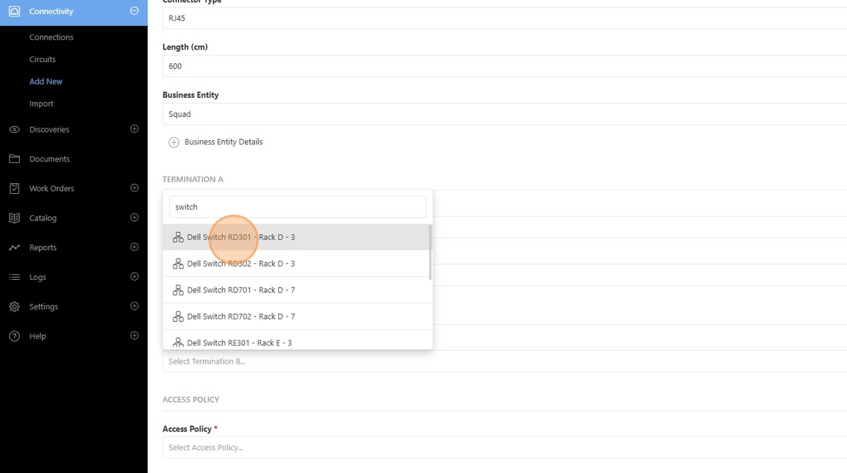 Click the “Termination A” field. An asset picker menu will open allowing you to select the Connection Side A device.